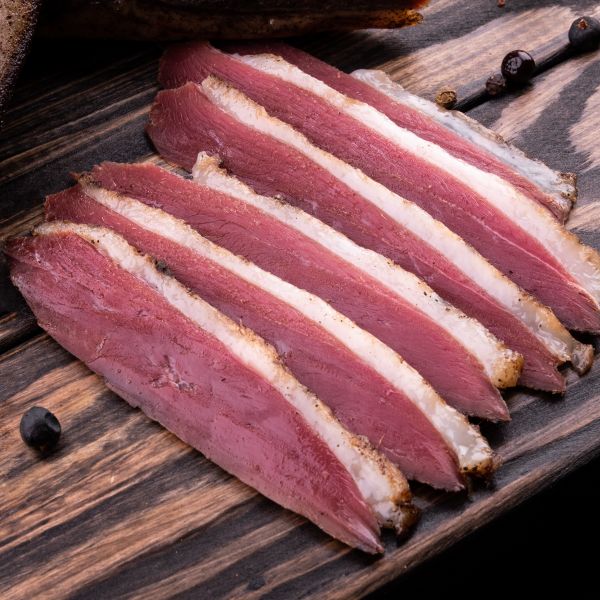 Чтобы приготовить вяленую утиную грудку, мы сначала засаливаем мясо, затем вымачиваем его, далее добавляем специи и вялим. Чтобы добавить пикантности, кладем можжевельник. Его вкус, лесной и хвойный, ассоциируется с дичью. По текстуре продукт плотный, не сухой, его легко нарезать на тонкие ломти.